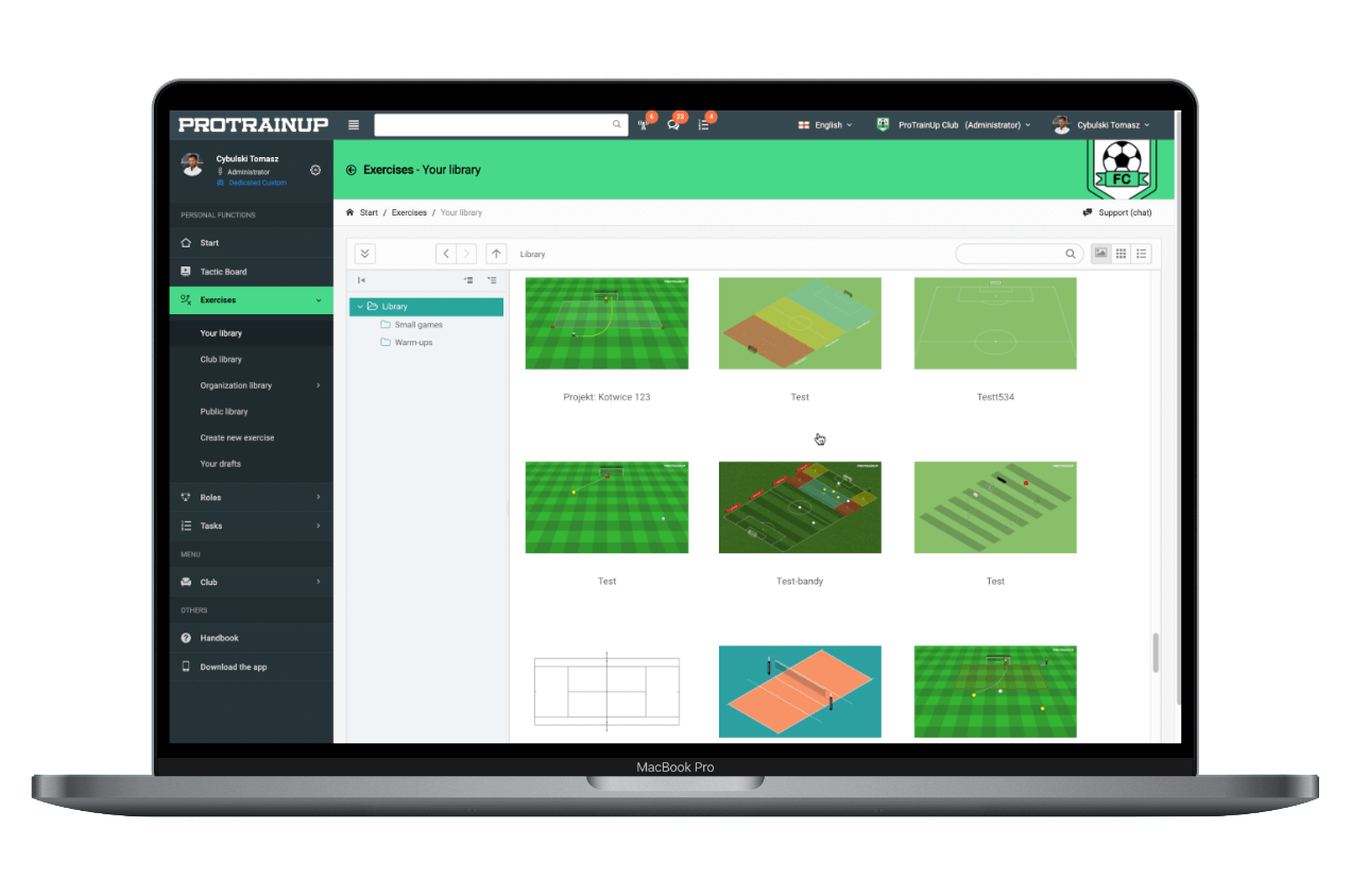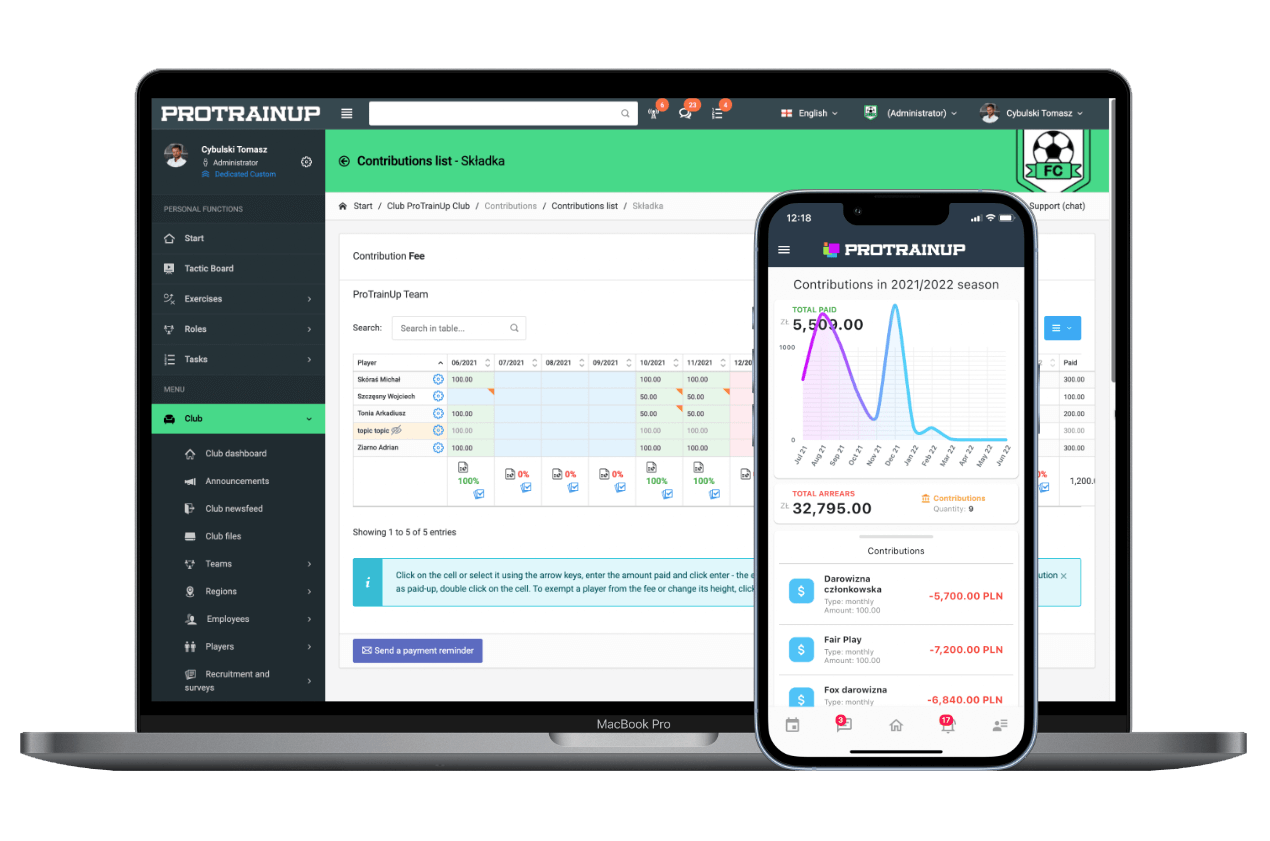 ¡Gracias a las posibilidades que ofrece ProTrainUp, puede administrar recursos humanos, controlar las contribuciones, construir una base de ejercicios o verificar la asistencia a los entrenamientos con unos pocos clics!