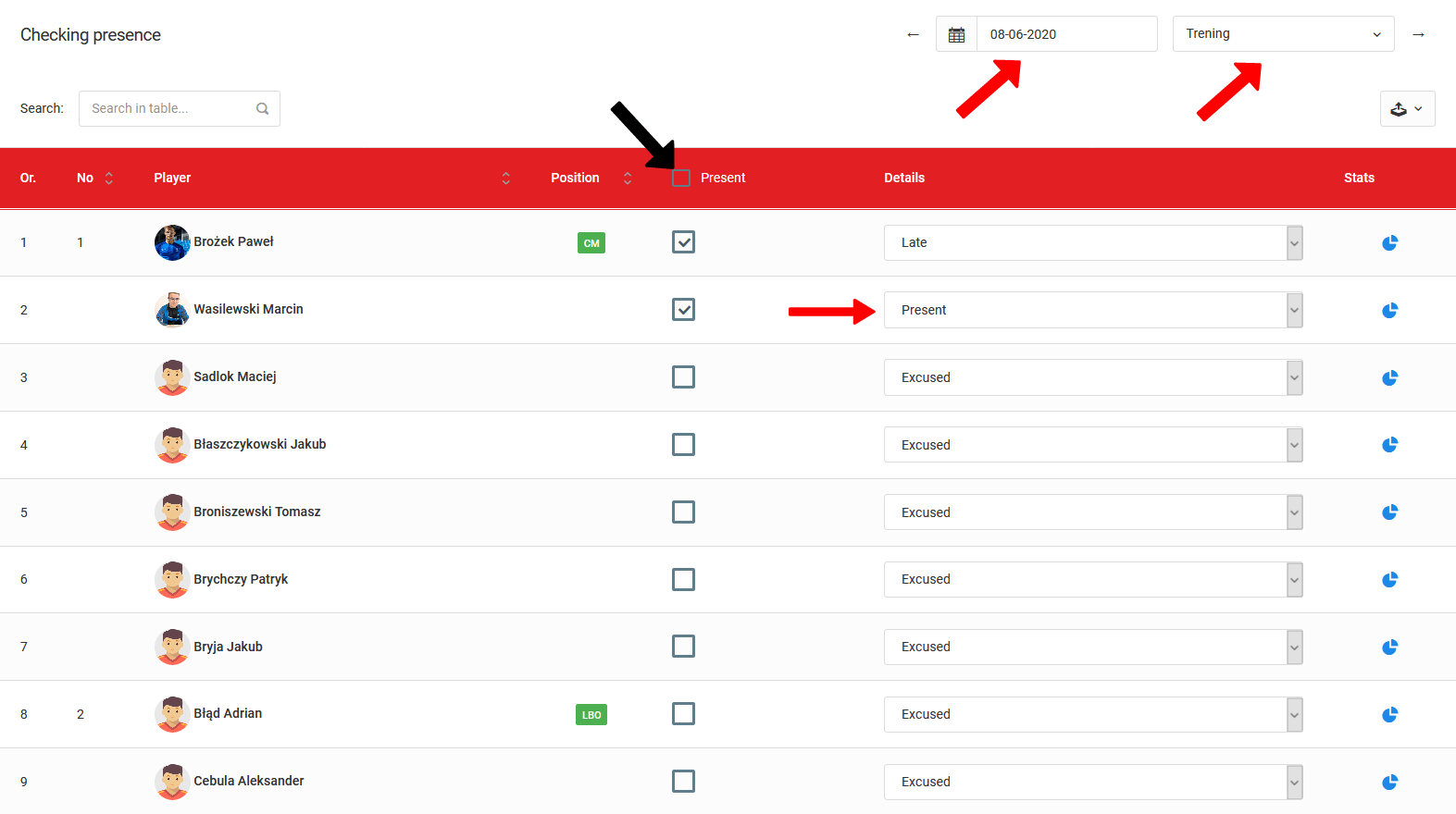 Hay varios elementos importantes en la ventana de verificación de presencia. Empezando desde arriba: dos casillas de verificación en la esquina superior derecha. Allí eliges una fecha y el entrenamiento relevante. Recuerda que tienes que crear una sesión de entrenamiento para verificar la presencia. Puedes crear más de un entrenamiento por día. También puedes planificar tu entrenamiento a través de la aplicación móvil. Otro elemento importante son las casillas de verificación, donde puedes seleccionar la presencia de un jugador en el entrenamiento. En la columna de detalles, puedes seleccionar el motivo de la ausencia de la lista desplegable.
