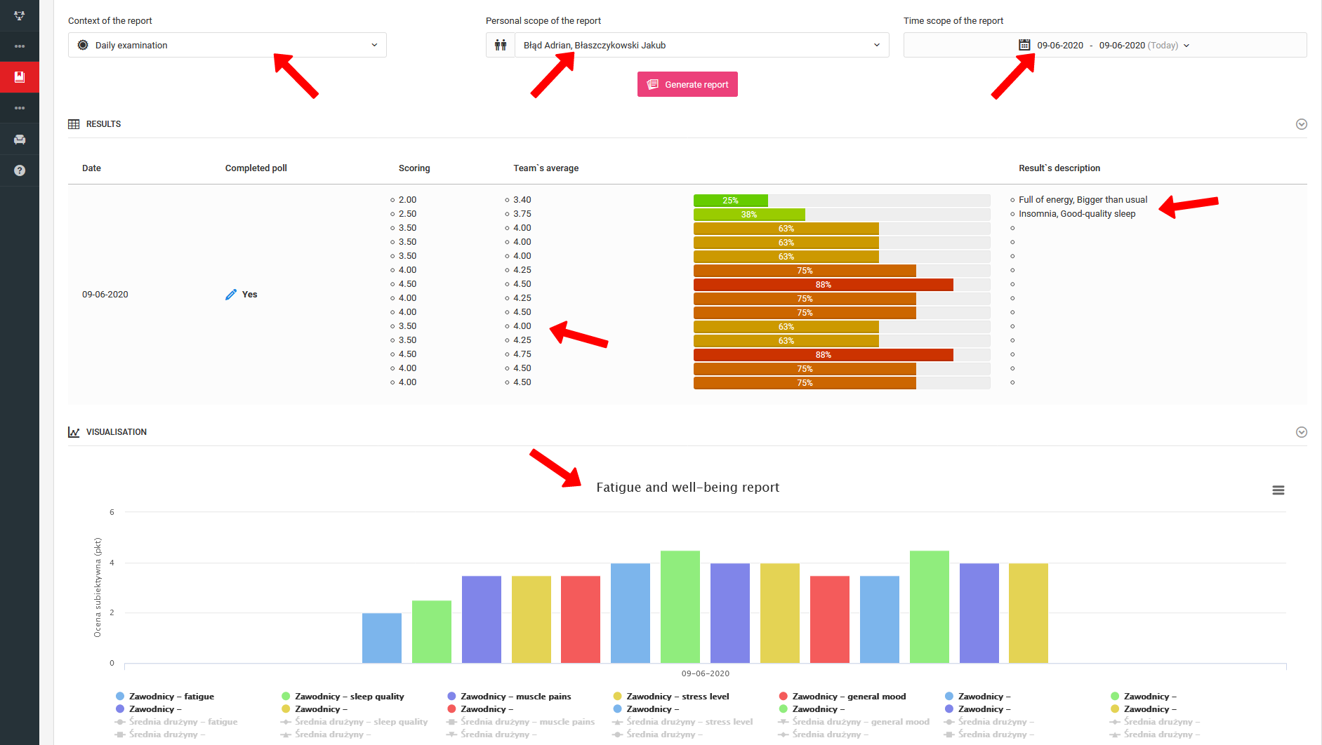 Los resultados presentados en los informes te proporcionan un análisis tanto unitario, por cada medición (día, entrenamiento, partido), como declaraciones colectivas en forma de gráficos que agregan datos en una línea de tiempo. Además, el análisis mostrará el cambio porcentual de los resultados en comparación con la última encuesta y la respuesta dominante entre los jugadores.