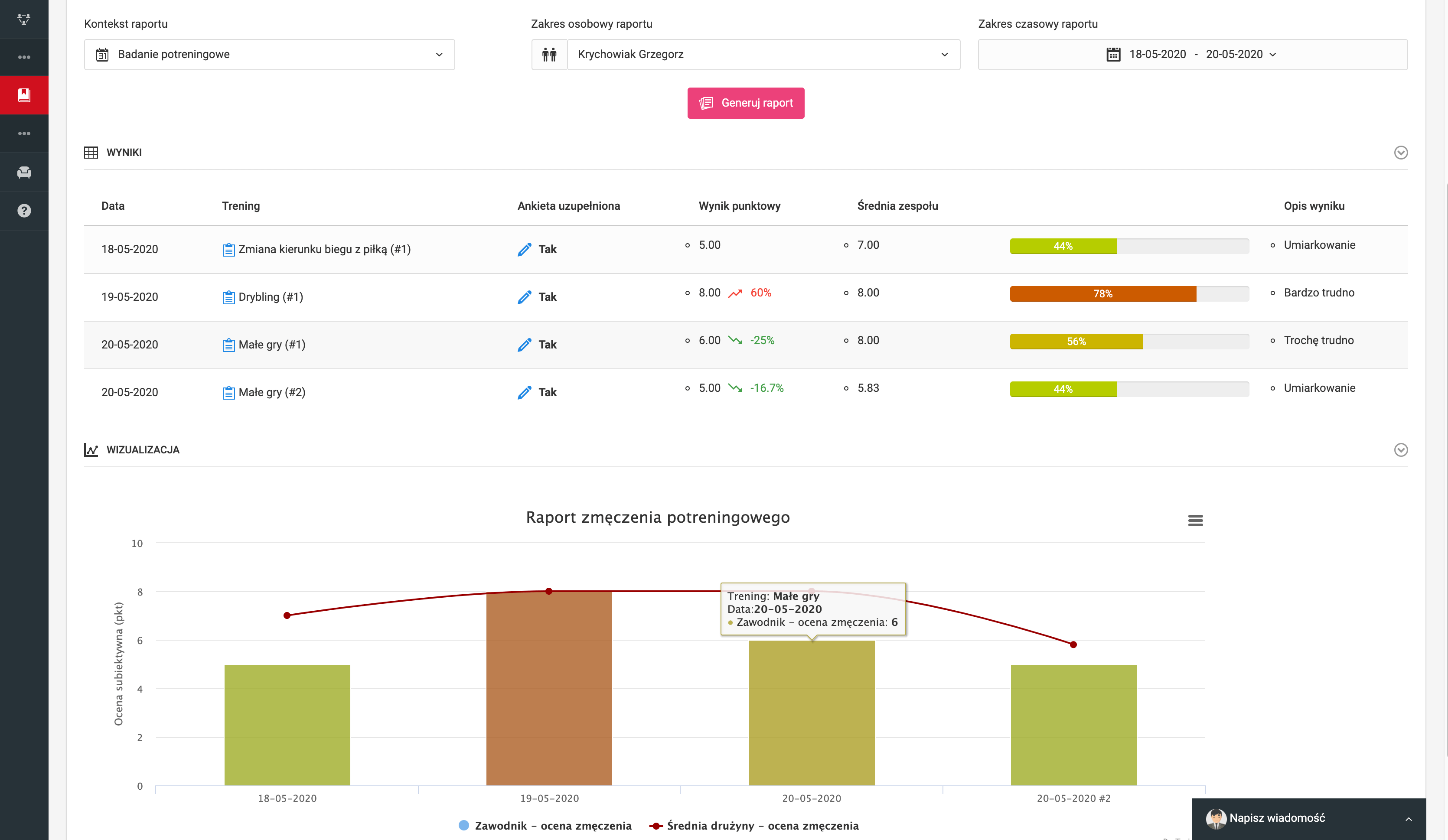 En el caso de los resultados individuales, puedes comparar los resultados de un jugador con el promedio de todo el equipo. El gráfico se genera dinámicamente y su rango cambiará a medida que cambien los parámetros de todo el informe. Puedes guardar cada gráfico en un archivo jpg o png y descargarlo en tu computadora. El jugador y el padre tienen acceso a los resultados de sus tutelados. No hay lugar en el sistema donde pueda comparar sus resultados con los de sus compañeros de equipo.
