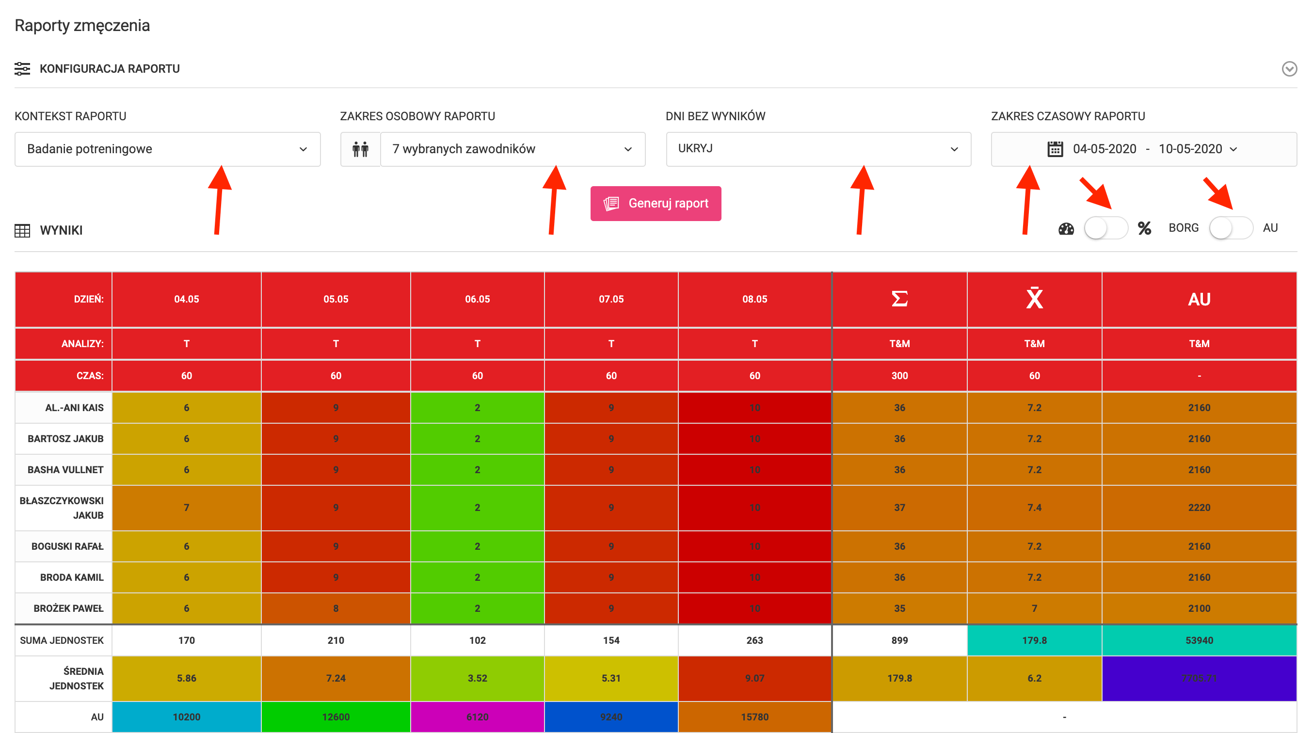 También está disponible en el sistema un informe resumen que muestra una amplia gama de datos con análisis. Encima de la tabla del informe, hay un configurador disponible. Al igual que en el caso de los informes detallados, puedes elegir qué tipo de estudios deben aparecer en la tabla. Puedes seleccionar qué jugadores se incluirán en el informe, marcar el rango de tiempo del informe y también ocultar los días sin mediciones. En el lado derecho, encima de la tabla, tienes dos controles deslizantes que afectan la forma en que se presentan los datos. El primero es responsable de cambiar la forma en que se calculan los resultados: puedes elegir un valor numérico o porcentual. En el segundo control deslizante, determinas si los datos se presentarán como un valor de escala o como unidades de fatiga calculadas (AU). Recuerda confirmar cada cambio en la configuración del informe y análisis con el botón rosa "generar informe". La tabla en sí contiene varios tipos de datos. En las columnas con las fechas en los encabezados, tienes los datos sobre los resultados específicos ingresados por el jugador. Las columnas pueden referirse a pruebas diarias, post-entrenamiento y post-partido. Las columnas detrás de la línea más gruesa y oscura se refieren al total, promedio y unidades de fatiga (AU) de los jugadores durante el período de tiempo seleccionado. En las líneas debajo de la línea más gruesa y oscura, tenemos resúmenes de los resultados de cada prueba para todo el equipo. Los colores utilizados en la tabla corresponden a los colores que los jugadores tienen que elegir al completar la encuesta. Verde - fatiga ligera, rojo oscuro - fatiga máxima.