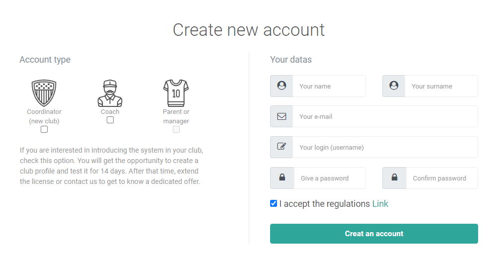 Para crear una cuenta en ProTrainUp, ingrese protrainup.com en su navegador. Luego, en el menú superior, haga clic en el botón "registro". A continuación, seleccione el tipo de cuenta que desea crear. Puede elegir una cuenta individual de entrenador o una licencia de club. Las cuentas de padres y jugadores siempre son creadas por los entrenadores o coordinadores.