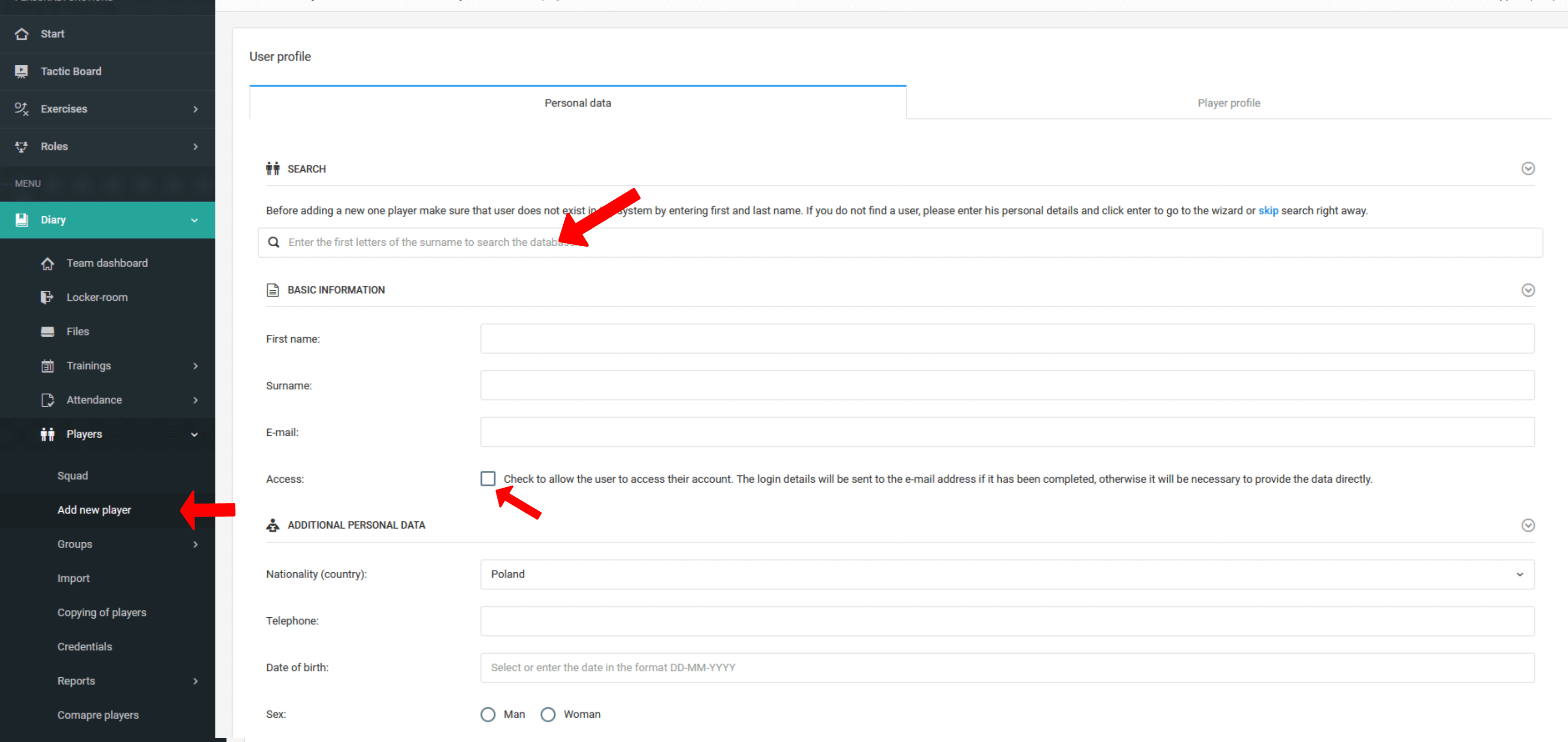 Para agregar jugadores, seleccione del menú izquierdo diario jugadores agregar nuevo jugador. En el siguiente paso, irá al formulario de agregar nuevo jugador. Si un jugador ya está en el sistema, puede buscarlo en el motor de búsqueda y así agregarlo a su equipo. Sin embargo, si aún no está en el sistema, créelo proporcionando un nombre, correo electrónico y fecha de nacimiento. Si desea que el jugador tenga acceso al sistema, también dele un nombre de usuario y contraseña haciendo clic en la casilla gris.