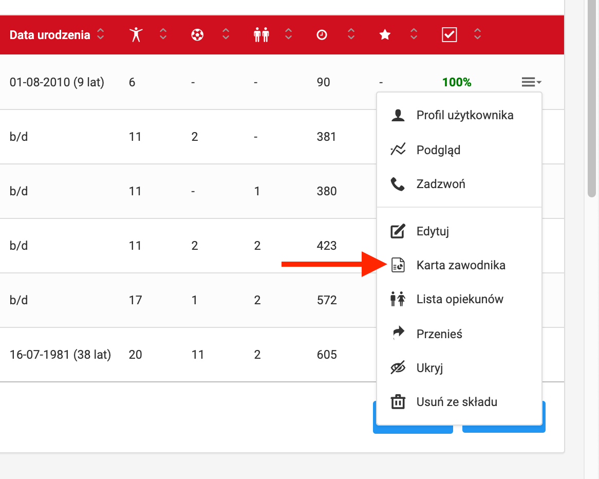 Cada jugador en el sistema tiene un perfil y una ficha de jugador generados automáticamente. Ambas pestañas recopilan los datos más importantes sobre el jugador en la temporada seleccionada. Para ir al perfil del jugador, debe ingresar a la lista de jugadores y hacer clic en el nombre del jugador.