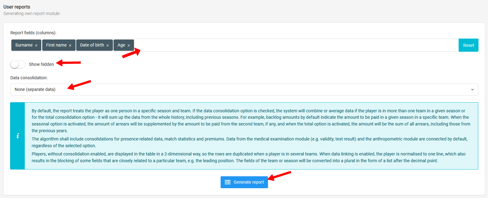 Para preparar su propio informe, ingrese los datos que desea agregar al campo del informe (columna). Cuando haya terminado de agregar columnas al informe, puede especificar dos detalles adicionales. El primero es si el informe debe incluir jugadores ocultos y el segundo es la consolidación de datos. Aquí decide si los datos de un jugador deben recopilarse solo para una temporada, para un equipo o para todos los datos concernientes a ese jugador.